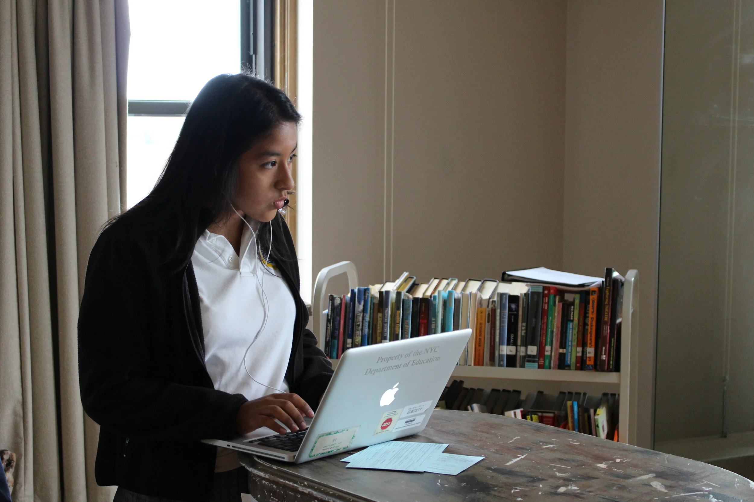 A student focuses on her presentation for Theatre class.